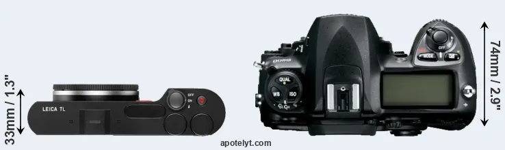 The physical size and weight of the Leica TL and the Nikon D200 are illustrated in the side-by-side display below. The two cameras are presented according to their relative size. Three consecutive perspectives from the front, the top, and the back are available. All width, height and depth dimensions are rounded to the nearest millimeter.