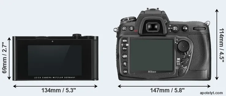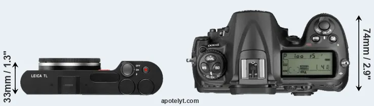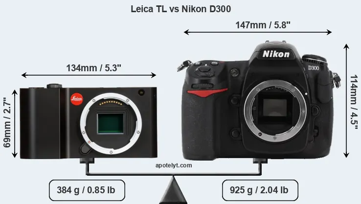 If the front view area (width x height) of the cameras is taken as an aggregate measure of their size, the Nikon D300 is considerably larger (81 percent) than the Leica TL. Moreover, the D300 is substantially heavier (141 percent) than the TL. It is noteworthy in this context that the D300 is splash and dust-proof, while the TL does not feature any corresponding weather-sealing.