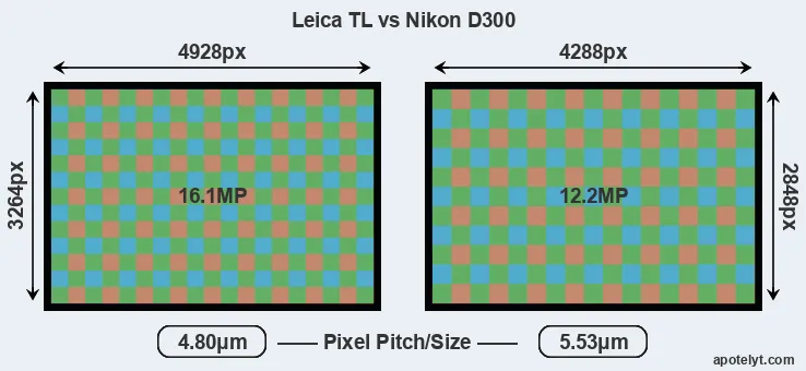 Despite having a slightly smaller sensor, the Leica TL offers a higher resolution of 16.1 megapixels, compared with 12.2 MP of the Nikon D300. This megapixels advantage comes at the cost of a higher pixel density and a smaller size of the individual pixel (with a pixel pitch of 4.80μm versus 5.53μm for the D300). However, it should be noted that the TL is much more recent (by 9 years and 2 months) than the D300, and its sensor will have benefitted from technological advances during this time that make it possible to gather light more efficiently. Coming back to sensor resolution, it should be mentioned that the TL has no anti-alias filter installed, so that it can capture all the detail its sensor resolves.