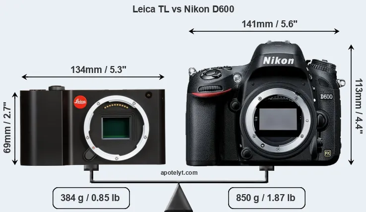 If the front view area (width x height) of the cameras is taken as an aggregate measure of their size, the Nikon D600 is considerably larger (72 percent) than the Leica TL. Moreover, the D600 is substantially heavier (121 percent) than the TL. It is noteworthy in this context that the D600 is splash and dust-proof, while the TL does not feature any corresponding weather-sealing.