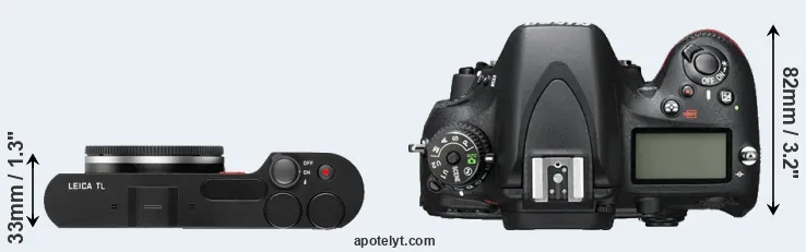 The physical size and weight of the Leica TL and the Nikon D600 are illustrated in the side-by-side display below. The two cameras are presented according to their relative size. Three successive views from the front, the top, and the rear are shown. All width, height and depth measures are rounded to the nearest millimeter.