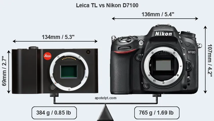If the front view area (width x height) of the cameras is taken as an aggregate measure of their size, the Nikon D7100 is considerably larger (57 percent) than the Leica TL. Moreover, the D7100 is substantially heavier (99 percent) than the TL. It is noteworthy in this context that the D7100 is splash and dust-proof, while the TL does not feature any corresponding weather-sealing.