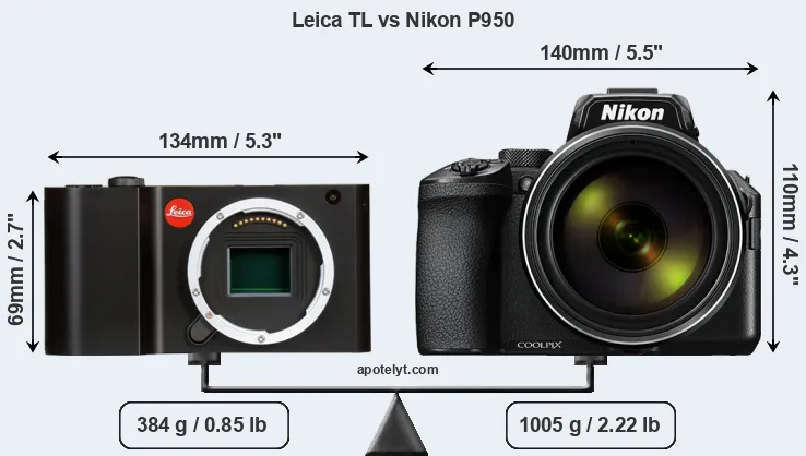 The side-by-side display below illustrates the physical size and weight of the Leica TL and the Nikon P950. The two cameras are presented according to their relative size. Three successive views from the front, the top, and the rear are shown. All size dimensions are rounded to the nearest millimeter.