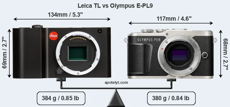 The physical size and weight of the Leica TL and the Olympus E-PL9 are illustrated in the side-by-side display below. The two cameras are presented according to their relative size. Three successive views from the front, the top, and the rear are shown. All width, height and depth measures are rounded to the nearest millimeter.