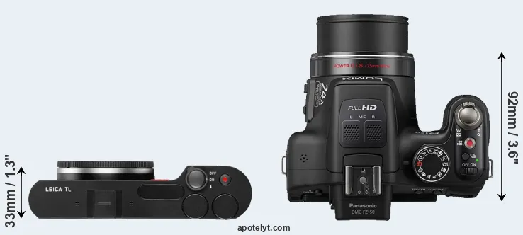 The side-by-side display below illustrates the physical size and weight of the Leica TL and the Panasonic FZ150. The two cameras are presented according to their relative size. Three successive views from the front, the top, and the rear are shown. All width, height and depth dimensions are rounded to the nearest millimeter.