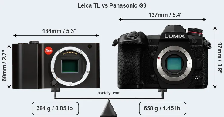 If the front view area (width x height) of the cameras is taken as an aggregate measure of their size, the Panasonic G9 is considerably larger (44 percent) than the Leica TL. Moreover, the G9 is substantially heavier (71 percent) than the TL. It is noteworthy in this context that the G9 is splash and dust-proof, while the TL does not feature any corresponding weather-sealing.