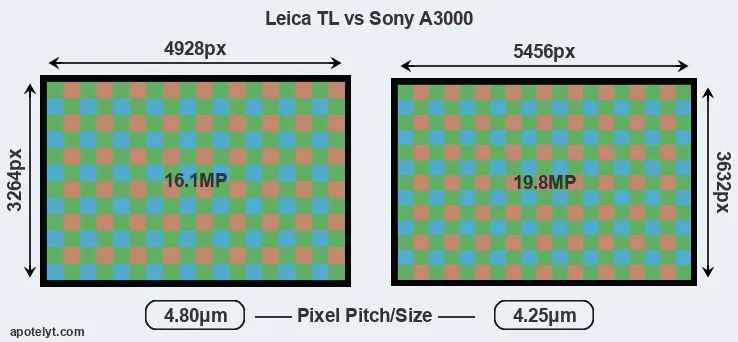 Despite having a slightly smaller sensor, the A3000 offers a higher resolution of 19.8 megapixels, compared with 16.1 MP of the TL. This megapixels advantage comes at the cost of a higher pixel density and a smaller size of the individual pixel (with a pixel pitch of 4.25μm versus 4.80μm for the TL). Moreover, it should be noted that the TL is much more recent (by 3 years and 2 months) than the A3000, and its sensor will have benefitted from technological advances during this time that further enhance the light gathering capacity of its pixels. Coming back to sensor resolution, it should be mentioned that the TL has no anti-alias filter installed, so that it can capture all the detail its sensor resolves.