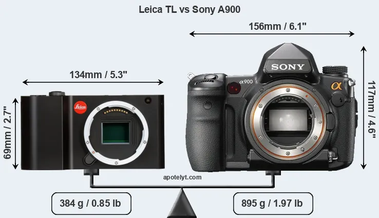 If the front view area (width x height) of the cameras is taken as an aggregate measure of their size, the Sony A900 is considerably larger (97 percent) than the Leica TL. Moreover, the A900 is substantially heavier (133 percent) than the TL. It is noteworthy in this context that the A900 is splash and dust-proof, while the TL does not feature any corresponding weather-sealing.