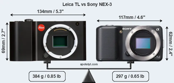 The physical size and weight of the Leica TL and the Sony NEX-3 are illustrated in the side-by-side display below. The two cameras are presented according to their relative size. Three consecutive perspectives from the front, the top, and the back are available. All width, height and depth dimensions are rounded to the nearest millimeter.