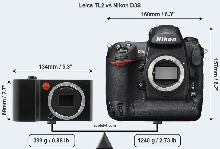 If the front view area (width x height) of the cameras is taken as an aggregate measure of their size, the Nikon D3S is considerably larger (172 percent) than the Leica TL2. Moreover, the D3S is substantially heavier (211 percent) than the TL2. It is noteworthy in this context that the D3S is splash and dust-proof, while the TL2 does not feature any corresponding weather-sealing.