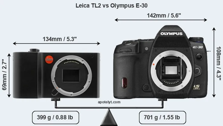 If the front view area (width x height) of the cameras is taken as an aggregate measure of their size, the Olympus E-30 is considerably larger (66 percent) than the Leica TL2. Moreover, the E-30 is substantially heavier (76 percent) than the TL2. In this context, it is worth noting that neither the TL2 nor the E-30 are weather-sealed.