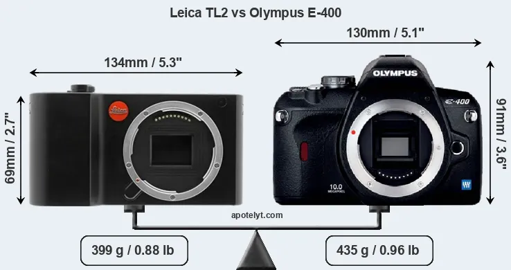 The physical size and weight of the Leica TL2 and the Olympus E-400 are illustrated in the side-by-side display below. The two cameras are presented according to their relative size. Three consecutive perspectives from the front, the top, and the back are available. All width, height and depth dimensions are rounded to the nearest millimeter.