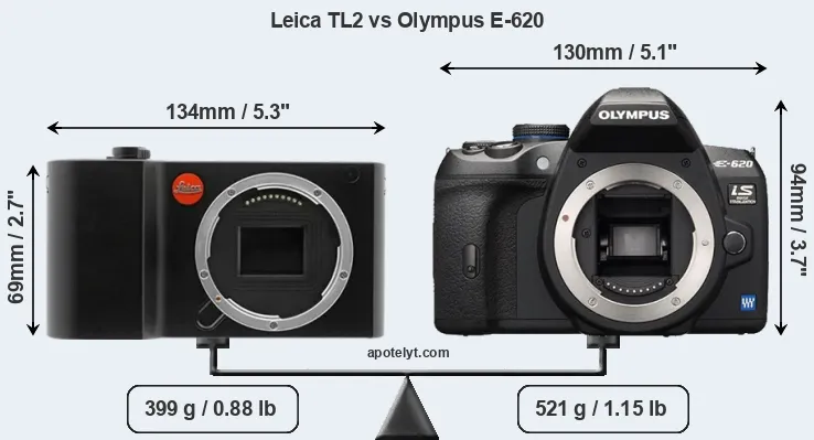 The physical size and weight of the Leica TL2 and the Olympus E-620 are illustrated in the side-by-side display below. The two cameras are presented according to their relative size. Three successive views from the front, the top, and the rear are shown. All width, height and depth dimensions are rounded to the nearest millimeter.