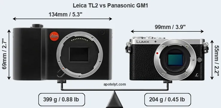 The physical size and weight of the Leica TL2 and the Panasonic GM1 are illustrated in the side-by-side display below. The two cameras are presented according to their relative size. Three successive views from the front, the top, and the rear are shown. All width, height and depth dimensions are rounded to the nearest millimeter.