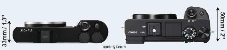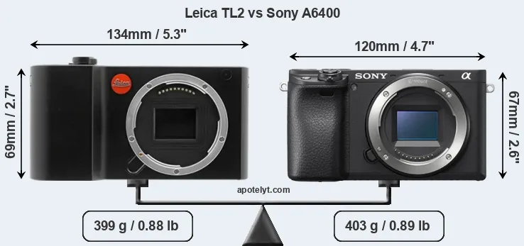 An illustration of the physical size and weight of the Leica TL2 and the Sony A6400 is provided in the side-by-side display below. The two cameras are presented according to their relative size. Three successive views from the front, the top, and the rear are shown. All size dimensions are rounded to the nearest millimeter.