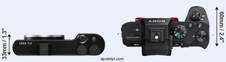 The side-by-side display below illustrates the physical size and weight of the Leica TL2 and the Sony A7 II. The two cameras are presented according to their relative size. Three consecutive views from the front, the top, and the rear side are shown. All width, height and depth dimensions are rounded to the nearest millimeter.