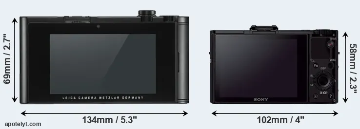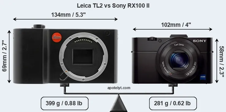 The side-by-side display below illustrates the physical size and weight of the Leica TL2 and the Sony RX100 II. The two cameras are presented according to their relative size. Three successive views from the front, the top, and the rear are shown. All width, height and depth measures are rounded to the nearest millimeter.