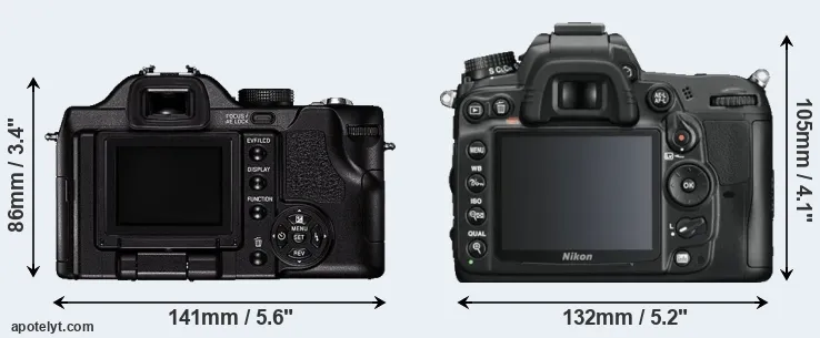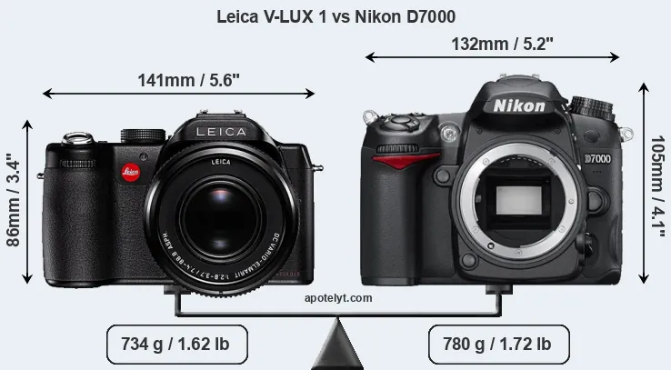 If the front view area (width x height) of the cameras is taken as an aggregate measure of their size, the Nikon D7000 is notably larger (14 percent) than the Leica V-LUX 1. It is noteworthy in this context that the D7000 is splash and dust-proof, while the V-LUX 1 does not feature any corresponding weather-sealing.