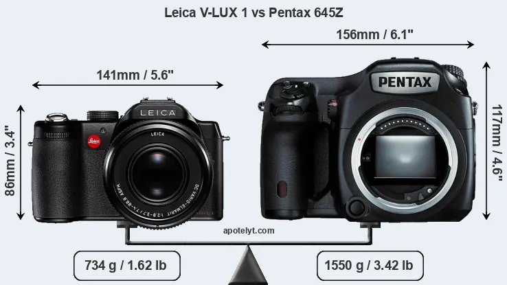 If the front view area (width x height) of the cameras is taken as an aggregate measure of their size, the Pentax 645Z is considerably larger (51 percent) than the Leica V-LUX 1. It is noteworthy in this context that the 645Z is splash and dust-proof, while the V-LUX 1 does not feature any corresponding weather-sealing.
