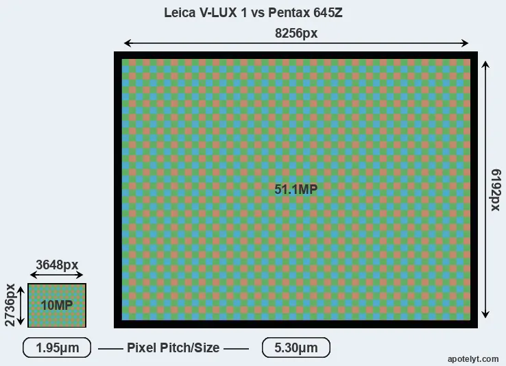 | Sensor Specs | Leica V-LUX 1 | Pentax 645Z |