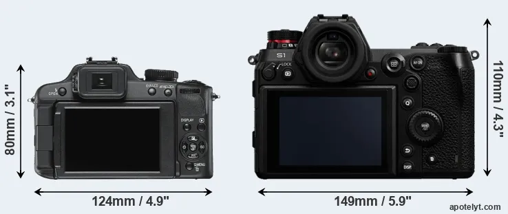 If the front view area (width x height) of the cameras is taken as an aggregate measure of their size, the Panasonic S1 is considerably larger (65 percent) than the Leica V-LUX 2. It is noteworthy in this context that the S1 is splash and dust-proof, while the V-LUX 2 does not feature any corresponding weather-sealing.