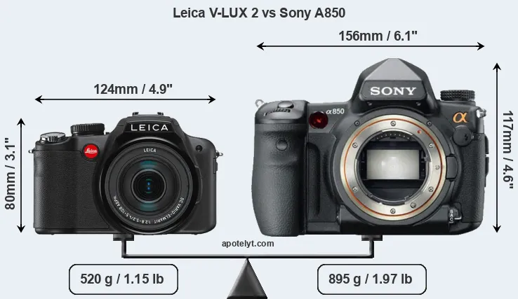 The side-by-side display below illustrates the physical size and weight of the Leica V-LUX 2 and the Sony A850. The two cameras are presented according to their relative size. Three consecutive perspectives from the front, the top, and the back are available. All width, height and depth measures are rounded to the nearest millimeter.