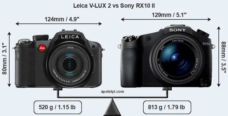 If the front view area (width x height) of the cameras is taken as an aggregate measure of their size, the Sony RX10 II is notably larger (14 percent) than the Leica V-LUX 2. Moreover, the RX10 II is substantially heavier (56 percent) than the V-LUX 2. It is noteworthy in this context that the RX10 II is splash and dust-proof, while the V-LUX 2 does not feature any corresponding weather-sealing.