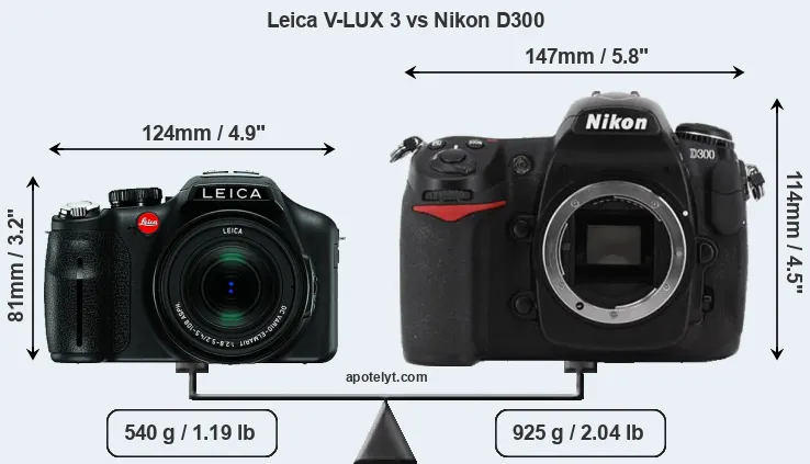 The physical size and weight of the Leica V-LUX 3 and the Nikon D300 are illustrated in the side-by-side display below. The two cameras are presented according to their relative size. Three consecutive perspectives from the front, the top, and the back are available. All width, height and depth dimensions are rounded to the nearest millimeter.
