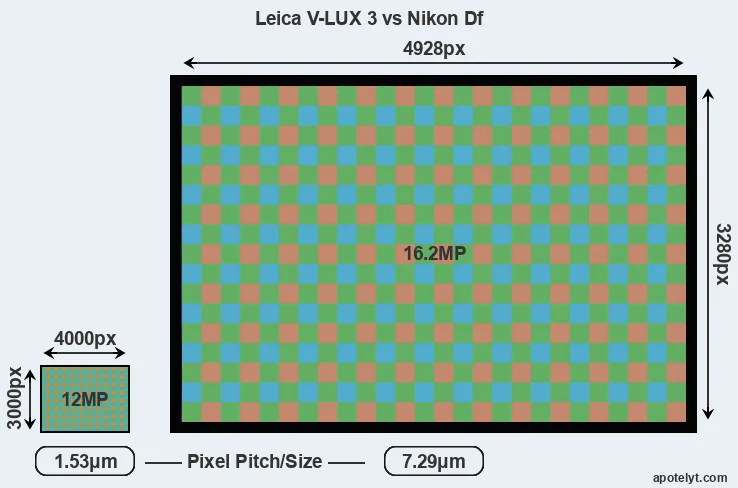 With 16.2MP, the Df offers a higher resolution than the V-LUX 3 (12MP), but the Df nevertheless has larger individual pixels (pixel pitch of 7.29μm versus 1.53μm for the V-LUX 3) due to its larger sensor. Moreover, the Df is a somewhat more recent model (by 1 year and 10 months) than the V-LUX 3, and its sensor might have benefitted from technological advances during this time that further enhance the light gathering capacity of its pixel-units. Coming back to sensor resolution, it should be mentioned that the V-LUX 3 has no anti-alias filter installed, so that it can capture all the detail its sensor resolves.