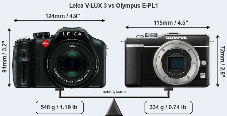 The side-by-side display below illustrates the physical size and weight of the Leica V-LUX 3 and the Olympus E-PL1. The two cameras are presented according to their relative size. Three consecutive perspectives from the front, the top, and the back are available. All width, height and depth measures are rounded to the nearest millimeter.