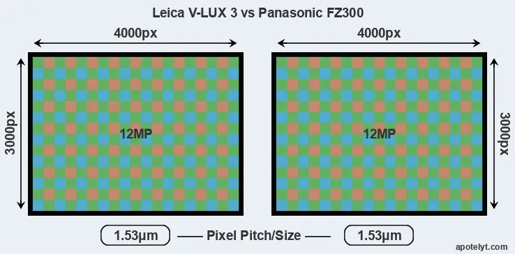 The two cameras under review do not only share the same sensor size, but also offer an identical resolution of 12 megapixels. This similarity in sensor specs implies that both the V-LUX 3 and the FZ300 have the same pixel density, as well as the same pixel size. It should, however, be noted that the FZ300 is much more recent (by 3 years and 7 months) than the V-LUX 3, and its sensor will have benefitted from technological advances during this time. Coming back to sensor resolution, it should be mentioned that neither of the two cameras has an anti-alias filter installed, so they are able to capture all the detail the sensor resolves.