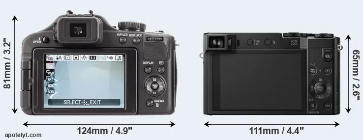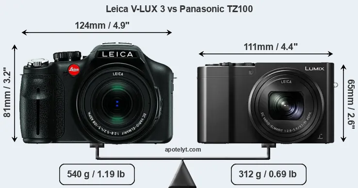 The side-by-side display below illustrates the physical size and weight of the Leica V-LUX 3 and the Panasonic TZ100. The two cameras are presented according to their relative size. Three consecutive perspectives from the front, the top, and the back are available. All width, height and depth dimensions are rounded to the nearest millimeter.