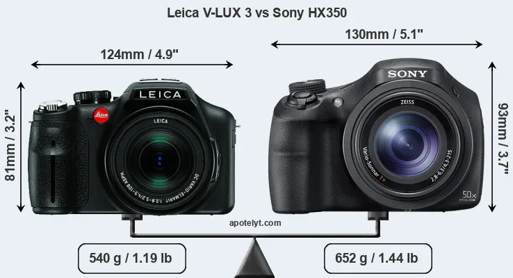 The physical size and weight of the Leica V-LUX 3 and the Sony HX350 are illustrated in the side-by-side display below. The two cameras are presented according to their relative size. Three consecutive perspectives from the front, the top, and the back are available. All width, height and depth measures are rounded to the nearest millimeter.