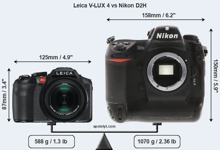 The side-by-side display below illustrates the physical size and weight of the Leica V-LUX 4 and the Nikon D2H. The two cameras are presented according to their relative size. Three successive views from the front, the top, and the rear are shown. All width, height and depth measures are rounded to the nearest millimeter.