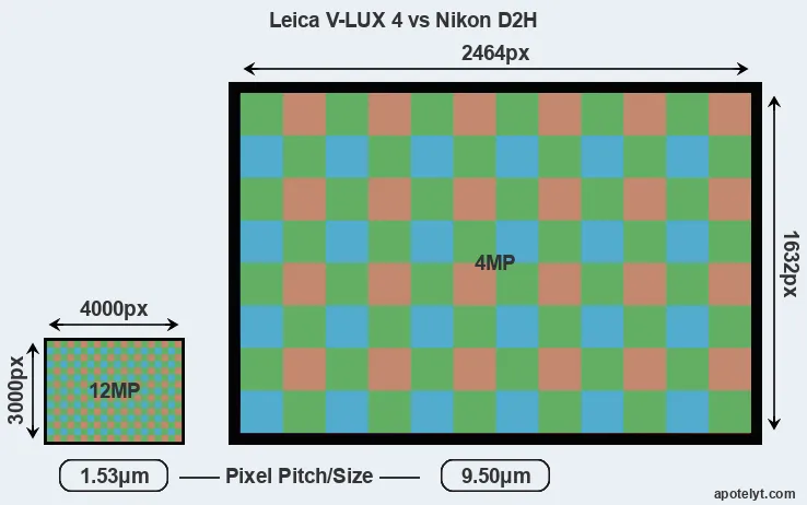 Despite having a smaller sensor, the Leica V-LUX 4 offers a higher resolution of 12 megapixels, compared with 4 MP of the Nikon D2H. This megapixels advantage comes at the cost of a higher pixel density and a smaller size of the individual pixel (with a pixel pitch of 1.53μm versus 9.50μm for the D2H). However, it should be noted that the V-LUX 4 is much more recent (by 9 years and 1 month) than the D2H, and its sensor will have benefitted from technological advances during this time that make it possible to gather light more efficiently. Coming back to sensor resolution, it should be mentioned that the V-LUX 4 has no anti-alias filter installed, so that it can capture all the detail its sensor resolves.
