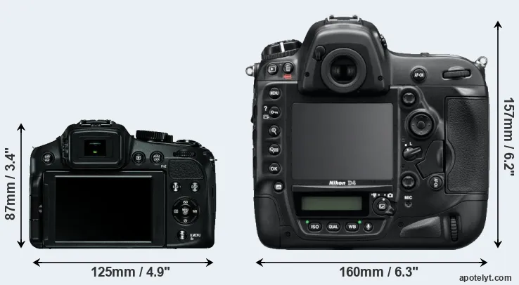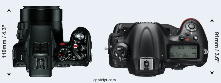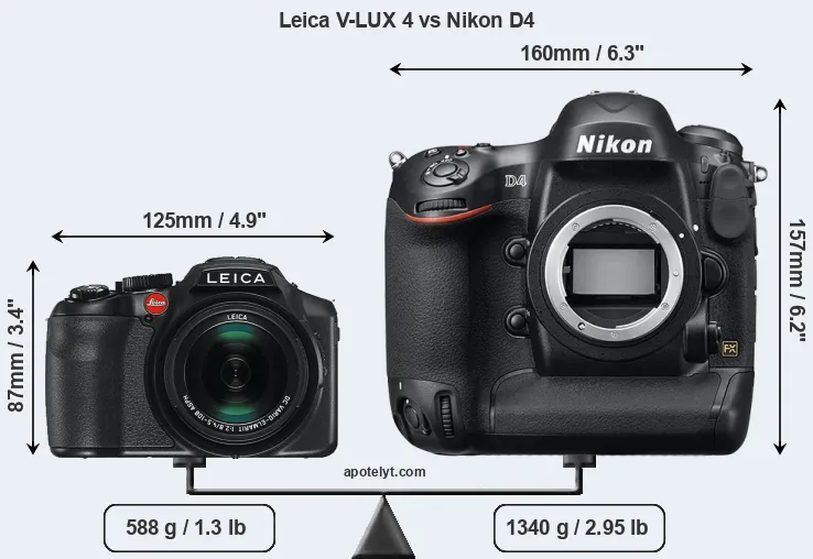 The side-by-side display below illustrates the physical size and weight of the Leica V-LUX 4 and the Nikon D4. The two cameras are presented according to their relative size. Three consecutive perspectives from the front, the top, and the back are available. All size dimensions are rounded to the nearest millimeter.
