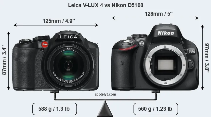 An illustration of the physical size and weight of the Leica V-LUX 4 and the Nikon D5100 is provided in the side-by-side display below. The two cameras are presented according to their relative size. Three consecutive perspectives from the front, the top, and the back are available. All width, height and depth measures are rounded to the nearest millimeter.