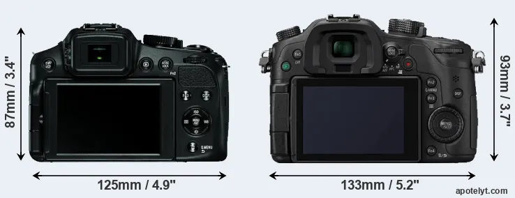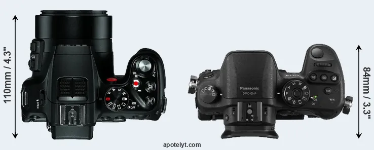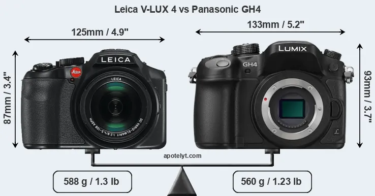 An illustration of the physical size and weight of the Leica V-LUX 4 and the Panasonic GH4 is provided in the side-by-side display below. The two cameras are presented according to their relative size. Three consecutive perspectives from the front, the top, and the back are available. All width, height and depth measures are rounded to the nearest millimeter.
