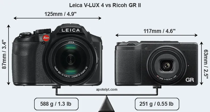 If the front view area (width x height) of the cameras is taken as an aggregate measure of their size, the Ricoh GR II is considerably smaller (32 percent) than the Leica V-LUX 4. Moreover, the GR II is substantially lighter (57 percent) than the V-LUX 4. In this context, it is worth noting that neither the V-LUX 4 nor the GR II are weather-sealed.
