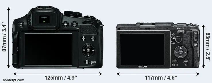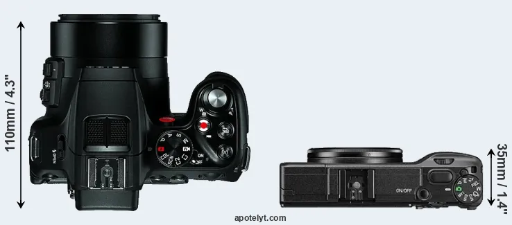 The side-by-side display below illustrates the physical size and weight of the Leica V-LUX 4 and the Ricoh GR II. The two cameras are presented according to their relative size. Three successive views from the front, the top, and the rear are shown. All size dimensions are rounded to the nearest millimeter.