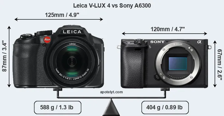 The side-by-side display below illustrates the physical size and weight of the Leica V-LUX 4 and the Sony A6300. The two cameras are presented according to their relative size. Three successive views from the front, the top, and the rear are shown. All width, height and depth measures are rounded to the nearest millimeter.