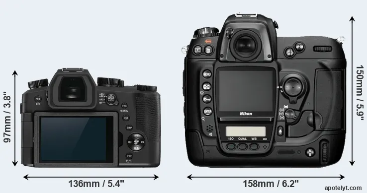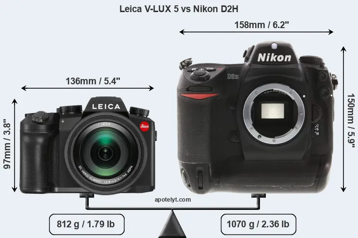 The side-by-side display below illustrates the physical size and weight of the Leica V-LUX 5 and the Nikon D2H. The two cameras are presented according to their relative size. Three consecutive perspectives from the front, the top, and the back are available. All width, height and depth dimensions are rounded to the nearest millimeter.