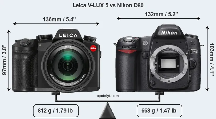 An illustration of the physical size and weight of the Leica V-LUX 5 and the Nikon D80 is provided in the side-by-side display below. The two cameras are presented according to their relative size. Three consecutive perspectives from the front, the top, and the back are available. All size dimensions are rounded to the nearest millimeter.