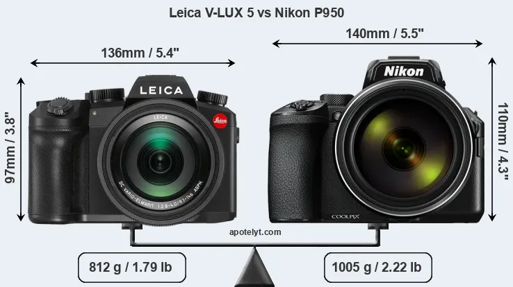 An illustration of the physical size and weight of the Leica V-LUX 5 and the Nikon P950 is provided in the side-by-side display below. The two cameras are presented according to their relative size. Three successive views from the front, the top, and the rear are shown. All width, height and depth dimensions are rounded to the nearest millimeter.