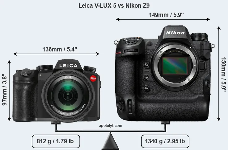 If the front view area (width x height) of the cameras is taken as an aggregate measure of their size, the Nikon Z9 is considerably larger (69 percent) than the Leica V-LUX 5. It is noteworthy in this context that the Z9 is splash and dust-proof, while the V-LUX 5 does not feature any corresponding weather-sealing.