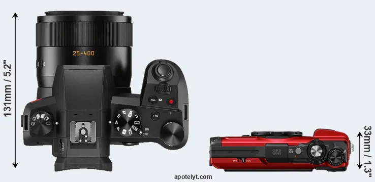The side-by-side display below illustrates the physical size and weight of the Leica V-LUX 5 and the OM System TG-7. The two cameras are presented according to their relative size. Three consecutive views from the front, the top, and the rear side are shown. All width, height and depth measures are rounded to the nearest millimeter.