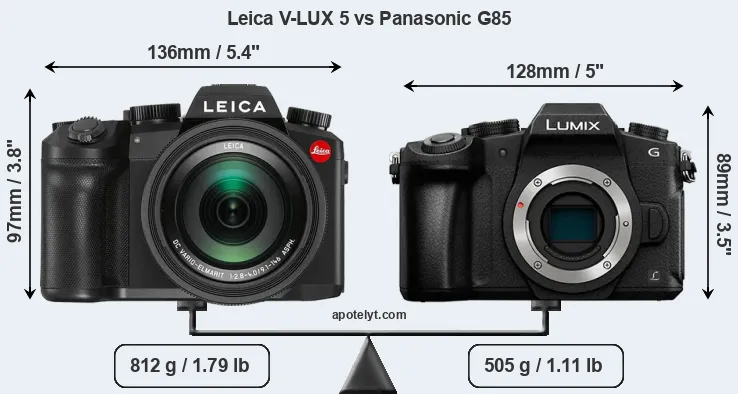 If the front view area (width x height) of the cameras is taken as an aggregate measure of their size, the Panasonic G85 is notably smaller (14 percent) than the Leica V-LUX 5. It is noteworthy in this context that the G85 is splash and dust-proof, while the V-LUX 5 does not feature any corresponding weather-sealing.