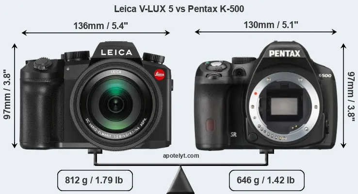 An illustration of the physical size and weight of the Leica V-LUX 5 and the Pentax K-500 is provided in the side-by-side display below. The two cameras are presented according to their relative size. Three successive views from the front, the top, and the rear are shown. All width, height and depth measures are rounded to the nearest millimeter.