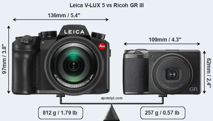 If the front view area (width x height) of the cameras is taken as an aggregate measure of their size, the Ricoh GR III is considerably smaller (49 percent) than the Leica V-LUX 5. Moreover, the GR III is substantially lighter (68 percent) than the V-LUX 5. In this context, it is worth noting that neither the V-LUX 5 nor the GR III are weather-sealed.