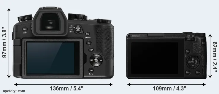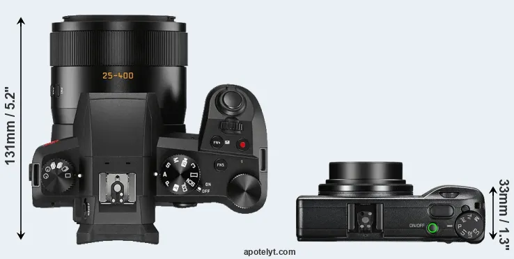 The physical size and weight of the Leica V-LUX 5 and the Ricoh GR III are illustrated in the side-by-side display below. The two cameras are presented according to their relative size. Three consecutive views from the front, the top, and the rear side are shown. All width, height and depth measures are rounded to the nearest millimeter.